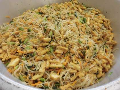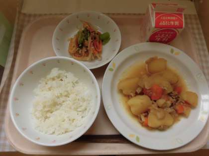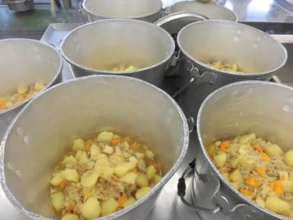 今日の給食は「肉じゃがうま煮」です。肉じゃがうま煮には、「ぶた肉 にんじん 高野豆腐 じゃがいも たまねぎ しらたき」と6種類の食べ物が入っている具だくさんな煮物になっています。今日も給食室の大釜でたくさん作りました。
