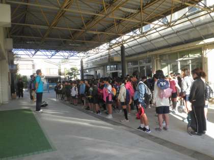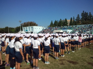今日は、6年生の連合運動会です。これまで一生懸命練習をしてきました。いい天気の中で、自分のベストをつくしてもらいたいと思います。学校で出発式をして、出かけました。開会式もきれいな青空のなかで行われました。