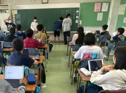 学級会で学級目標を何にするか話し合っています。タブレット端末を使ってキーワードを書き出し、共有しています。