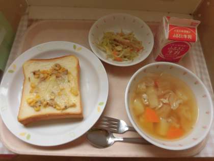 ☆今日の「ツナコーンチーズトースト」は みじん切りの玉葱 ツナ コーン パセリ マヨネーズを合わせたものを食パンの上にのせて、チーズをかけてオーブンで焼きました。家でも簡単にできますので、是非お試しください。