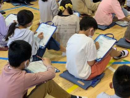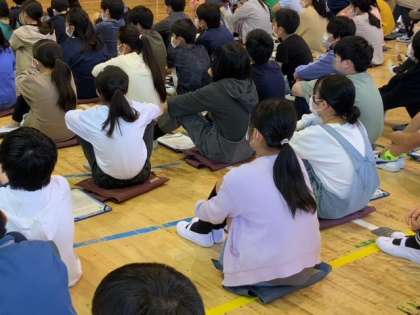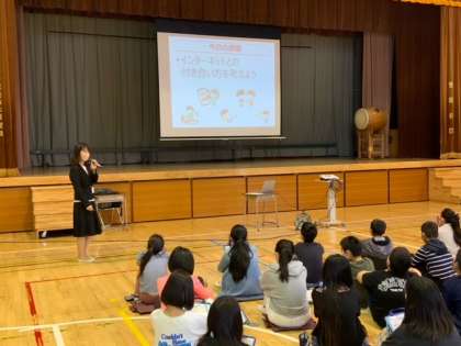 6年生は、体育館に集まり、講師をお招きしてのネットリテラシー醸成講座です。インターネットとの付き合い方を考えていきます。