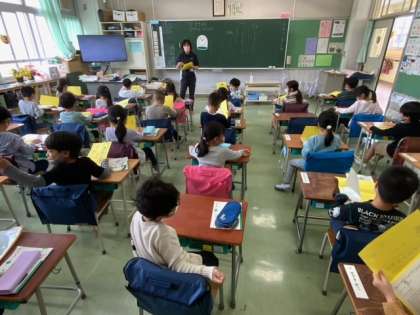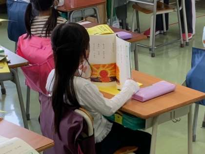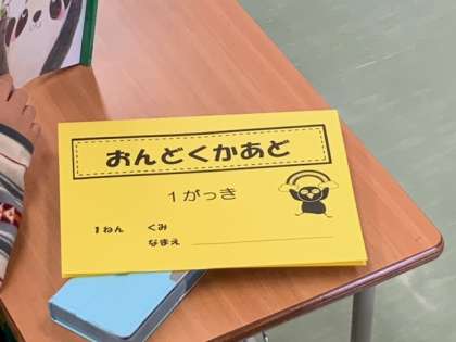 国語で音読カードが配られてその説明を受けています。1日5回読みます。ご家庭でのご協力もよろしくお願いします。