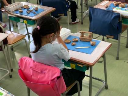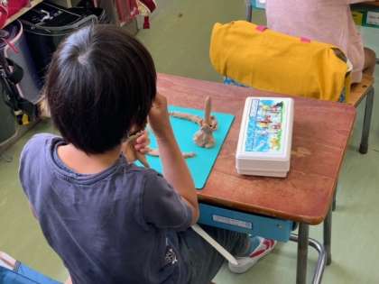 図工で粘土に取り組みます。粘土をたくさん触って感触を楽しみながら、いろいろな形のものをつくっていきます。