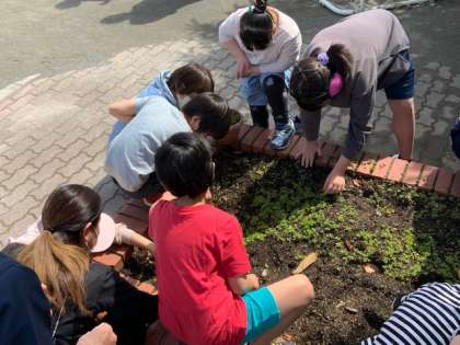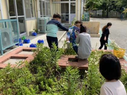 学級園の雑草抜きをしています。花壇に花を植えたり、夏野菜を植えたりしていきます。
