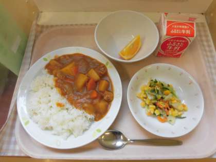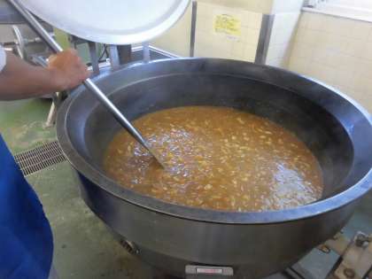 ☆今日は、みんなの好きなカレーライスです。給食室では、鶏ガラからしっかりスープを作り、カレールウも小麦粉 油 カレー粉を炒めた手作りルウです。今日も給食室の大釜でじっくり煮込み、カレーの完成です。
