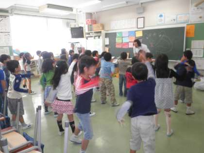今日は、1年全クラスと2の2の英語の学習でした。ALTの先生は、とっても明るくてノリの良い先生で、大きな声を出したり、繰り返したりして、単語を覚える工夫をしてくださいます。体も楽しく動かしています。