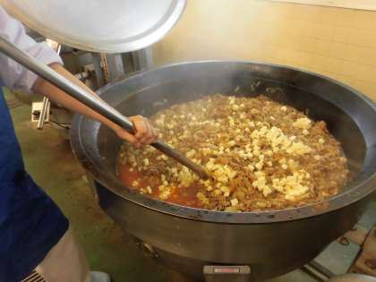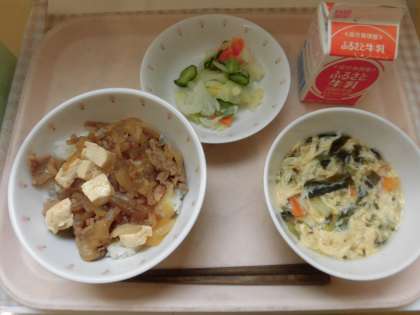 ☆今日は、子ども達の人気なメニュー「豚丼」です。給食室では、たくさんのたまねぎをスライスをして、豚肉とたまねぎを炒めました。炒めたものに、豆腐、糸こんにゃくを入れ、醤油 砂糖 みりんを加え味をつけて、ごはんの上にのせて完成です。