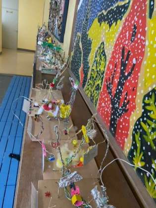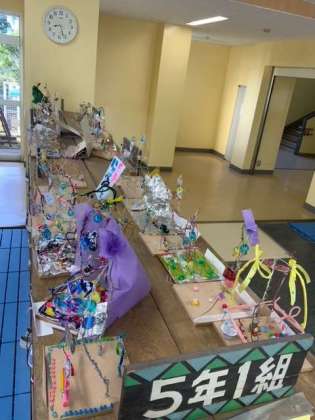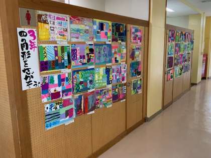 昇降口の靴箱やトイレの入口の壁に子どもたちの作品が展示されはじめました。楽しく取り組めたことが伝わってきます。5年生の「ハリガネランド」と3年生の「四角形をさがそう!」です。