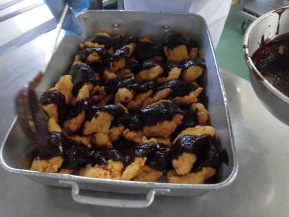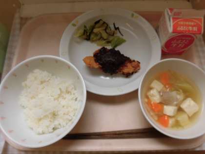 ☆今日の給食は「味噌チキンカツ」です。カラッと揚げた、チキンカツに味噌ダレをかけました。名古屋名物の1つで、一般にはソースをかけるチキンカツに対して、八丁みそを使うのが特徴です。食欲が増す1品となりました。
