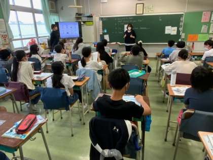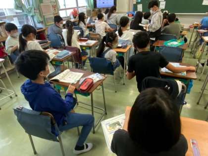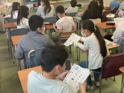 外国語の授業で、外国からの観光客の役と案内役に分かれて、季節ごとの日本の行事を紹介していきます。ペアになって英語会話の練習をしています。