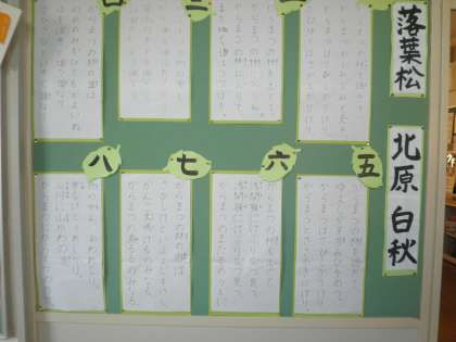 職員室の前と第四昇降口にことばの広場のコーナーがあります。職員室前は北原白秋の「落葉松」の詩が貼ってありました。まだまだ温かいのに……と思っていましたが、遊具のところの木々はもう色づいていました。温かくても、秋は確実にやってきます。