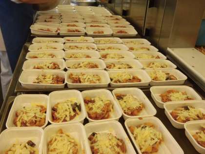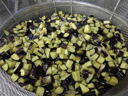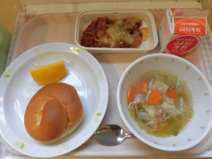 ☆今日の給食は「なすのミートグラタン」です。なすが苦手な人も多いですが、みんなが食べやすいように、なすを油で揚げて、ケチャップで味付けをしました。グラタンカップに出来た具材を入れ、その上にチーズとパン粉をのせてオーブンで焼き完成です。