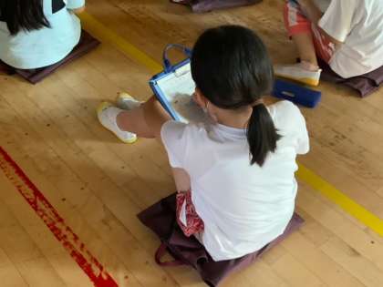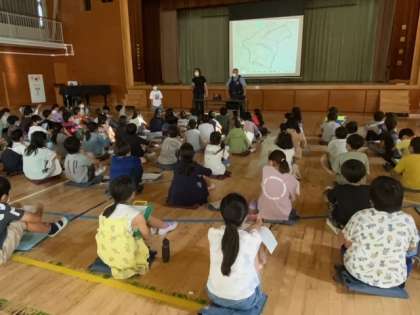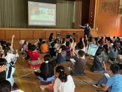 駐在所のお巡りさんをゲストティーチャーとしてお招きして、烏や小学校の学区域の交通で危ない場所や防犯上危ない場所を教えていただきました。教えていただいたことを元にして、安全マップを作っていきます。