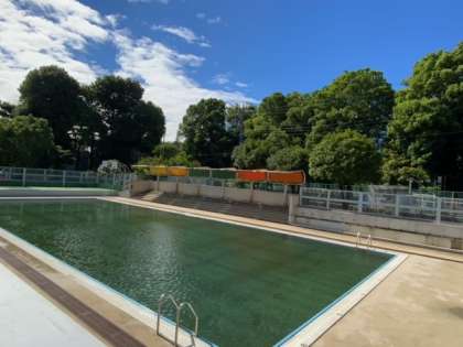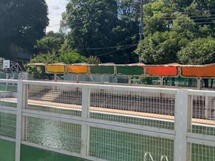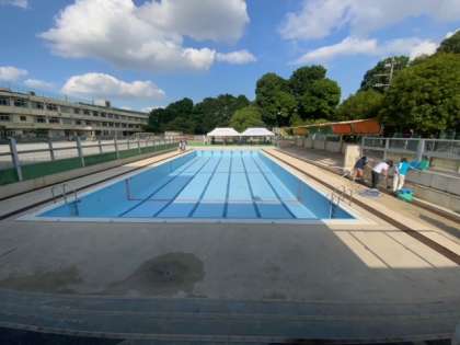 体育館横にあるプールのフタが外され、姿が現れました。教員でテントや使う道具などの準備をしました。水泳指導の準備を進めています。