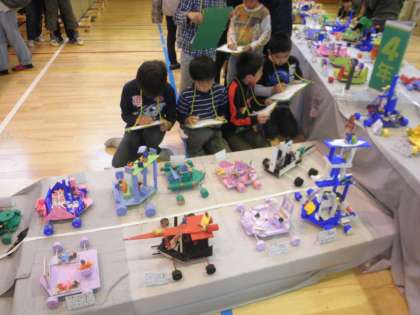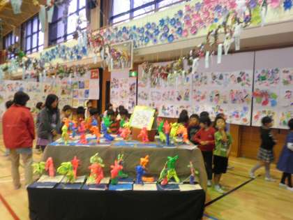 子どもたちも、今日は鑑賞日で、いろいろな作品を真剣に見て、鑑賞カードに記入しています。2年生の男の子たちは、4年生の「ゆめの車」がお気に入りの子が多いようで、みんな一生懸命に見ています。