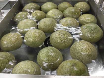 ☆今日のデザートは「メロン」です。茨城県さんのもので、たくさんのメロンを洗い包丁でカットしました。マイルドでさっぱりとしたメロンでした。