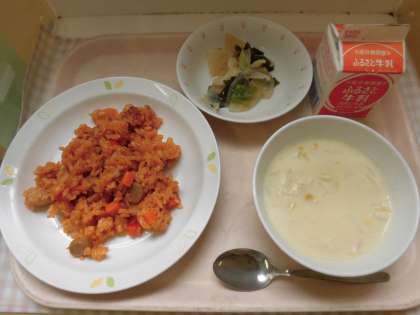 ☆今日の「ジャンバラヤ」は、アメリカ南部ルイジアナ州の料理です。辛いスパイスを使うのが特徴で、少し辛めの仕上がりでしたが、よく食べていました。