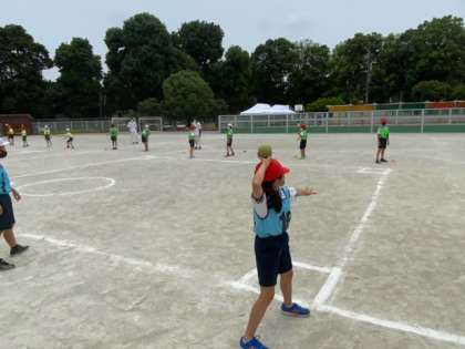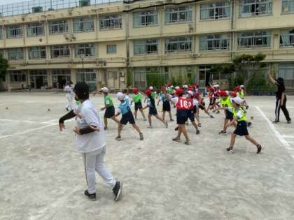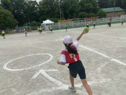 ゲストティーチャーにジャイアンツアカデミーをお招きして、ベースボール型のゲームについて学びました。ボールの投げ方を教わり、即実践です。横を向いて、ボールを持った手の甲で頭をポンポン2回叩いて、クルッと腰を回して、相手にワンバウンドでボールを投げます。子どもたちは、投げる度にどんどん上手くなっていきました。