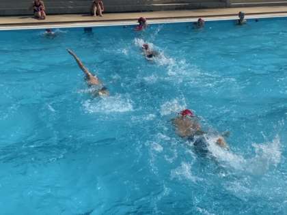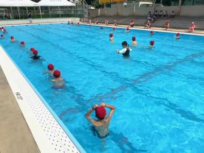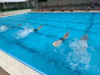 水泳です。晴れて水温も27度以上あって、とてもいい気持ちです。水慣れをしっかりしてから、けのびやバタ足、クロールなどに取り組みました。