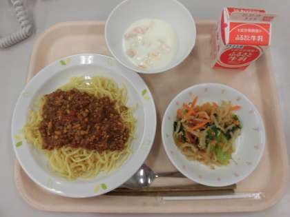 ☆今日の給食は「ジャージャー麺」です。ジャージャー麺の肉みそには、豚ひき肉や鶏ひき肉の他に大豆やたまねぎ、人参のみじん切りも入り具だくさんです。甘めのピリ辛の肉みそが食欲を増します。今日は暑いので、ピッタリのメニューですね。