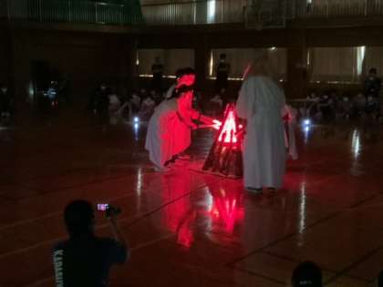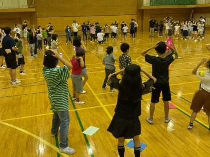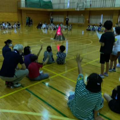キャンドルファイヤーです。烏山小学校が司会と進行を務めます。歌ったり、踊ったり、ゲームをしたりして盛り上がっています。