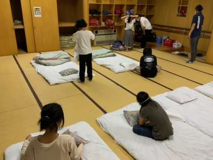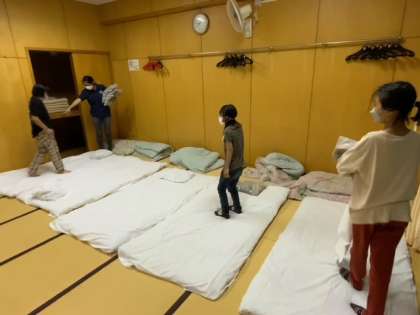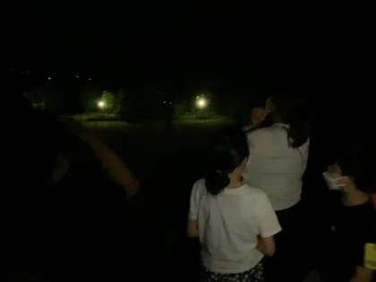 女の子たちの部屋は、布団を敷いています。その後、星満天タイムで屋上に出かけました。星は少し見えました。遠くの稲光りも見えます。