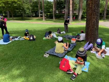 お昼ご飯です。芝生の上で食べています。とても気持ちがいいです。