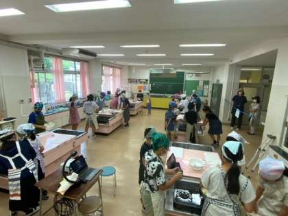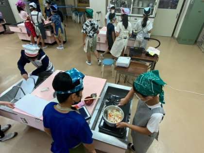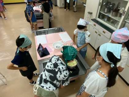 家庭科の調理実習です。9月に行われる川場移動教室でのカレー作りに向けての練習として、今回はポトフ作りに挑戦です。タブレットで作り方を確認しながら協力して作り進めています。