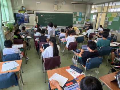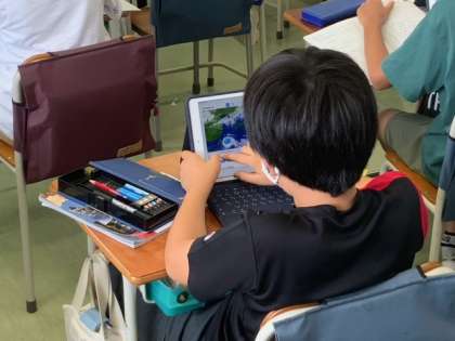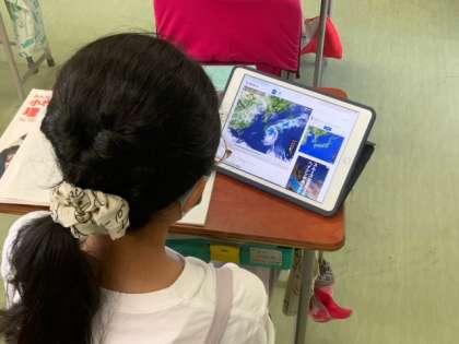 理科で、台風はどのように動いて日本に近づいてきて、天気はどのように変わるのかをタブレット端末を使って調べていきます。