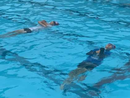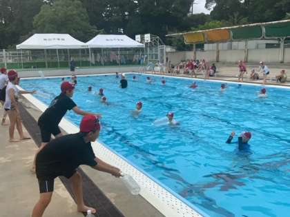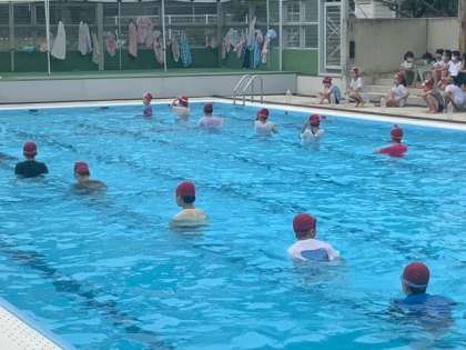 水泳の授業で着衣泳を行いました。服を着たまま水に入るとどうなるのかを体験し、もし、服を着たまま水に落ちてしまったらどうするのかを学びました。騒いだり、大声を出して肺の空気を失わないようにすることを知ったり、ペットボトルを抱えて浮いていられるように体験したりしました。
