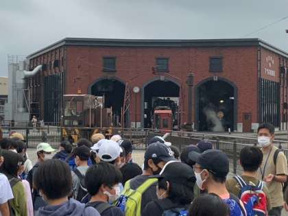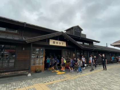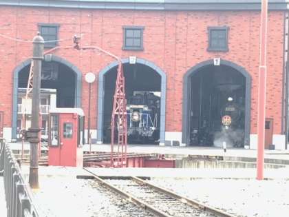下今市駅に到着しました。とても趣のある駅です。転車台広場でSLを見学し、到着を待ちます。