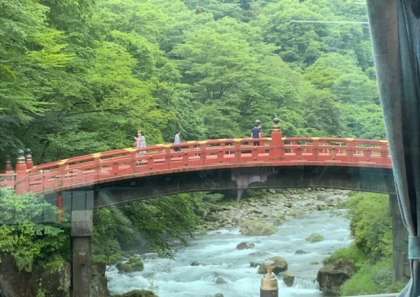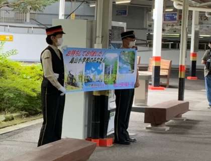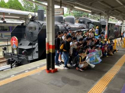 日光に到着しました。駅には、なんと横断幕を持って出迎えてくださっていました。SLと記念撮影をして、バスで移動をしています。