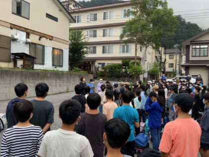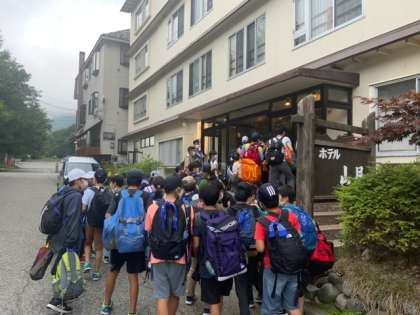 宿に到着し、開園式を行いました。とても涼しいです。そして、温泉の硫黄の香りが辺り一面に広がっています。