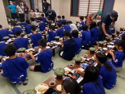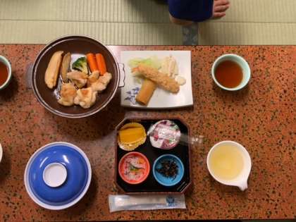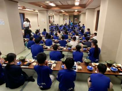宿での夕食です。大広間で皆で一緒にいただきます。