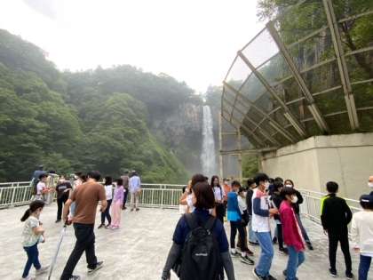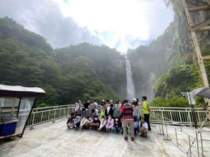 華厳の滝の見学です。滝のしぶきで、まるで雨の中にいるようです。クラス写真を撮りました。