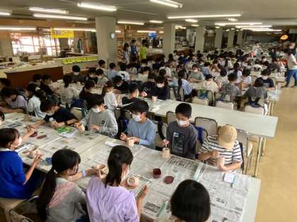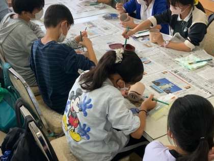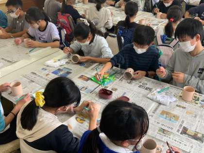 日荒レストセンターで益子焼体験です。まず、カップの裏に烏山小の「か」を書いてから、自分の好きな柄を描いていきます。作品づくりに集中するために、黙って取り組んでいます。