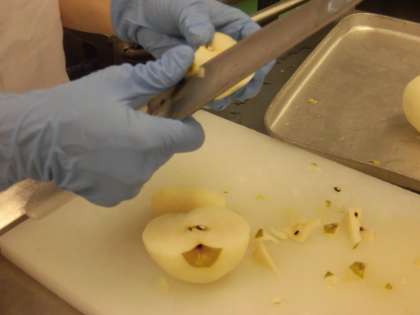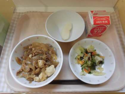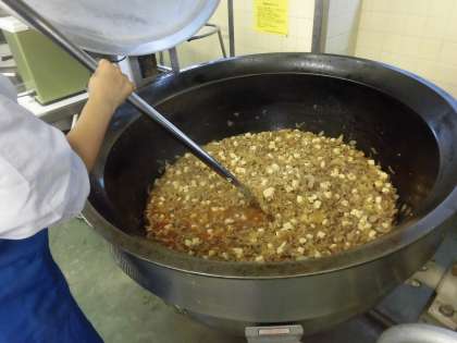 ☆今日から2学期の給食がスタートしました。今日は、みんなの好きな「豚丼」です。玉葱もたくさん切って、じっくりと給食室の大釜で煮込みました。煮込む事によって玉葱の甘さが増して更に美味しくなります。