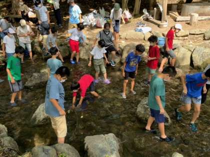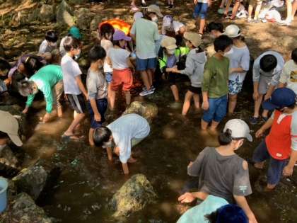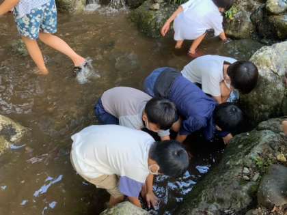 てんぐ広場の中にある川でマスつかみです。なかなか掴まりません。