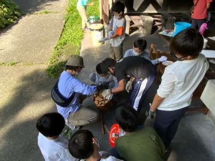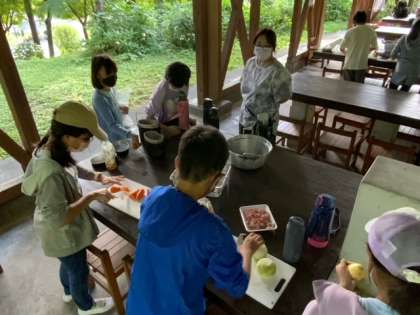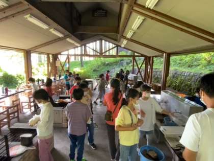 飯ごう炊さんでカレー作りです。クラスごとに分かれて火をつけるグループ、野菜を切るグループ、ご飯のグループに手分けをして作っていきます。