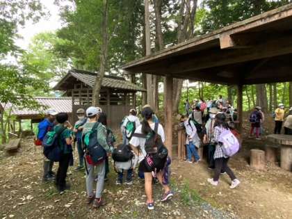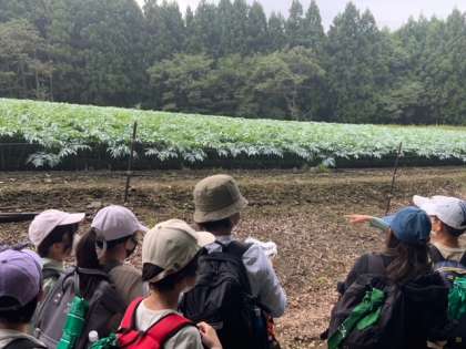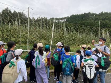 村めぐりに出発です。今の時期が一番の収穫期になるそうです。リンゴ、こんにゃく芋畑などを見学して、天狗山にやって来ました。