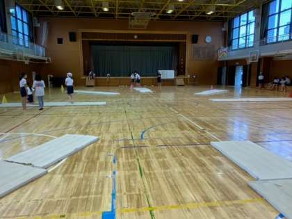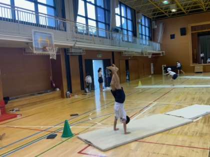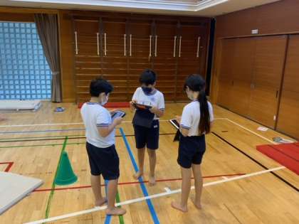 体育のマット運動で、自分の取り組みたい技を決めて、最終的に班ごとに構成して発表します。それぞれの技を磨き、班で話し合いながら進めています。