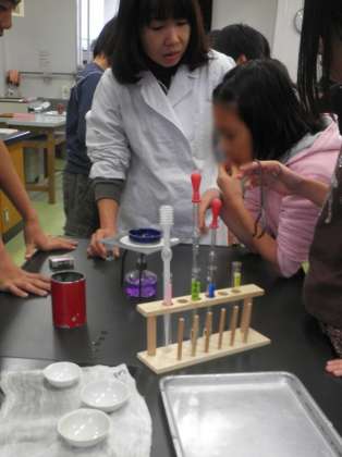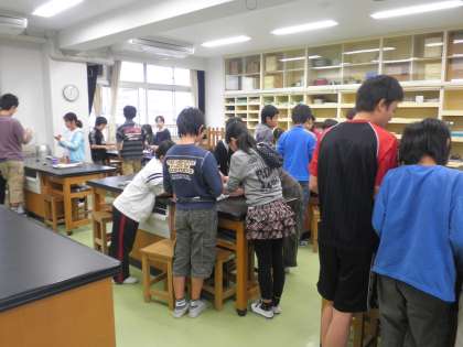 6先生が、理科の実験をしていました。「水溶液」の実験で金属を希塩酸で溶かしてみる実験です。危険なもののあるので、みんな腕をまくって慎重に実験に取り組んでいました。