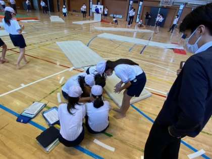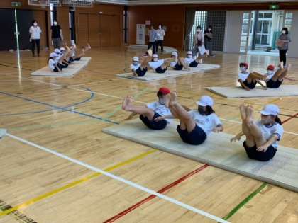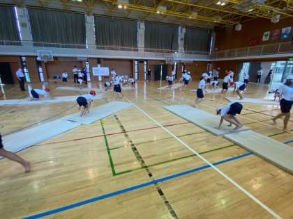 体育のマット運動で、グループで技を組み合わせたり、動きを合わせたりして発表をめざします。前半は準備運動の後に個人技を練習していきます。タブレットで見本を確認しているグループもあります。