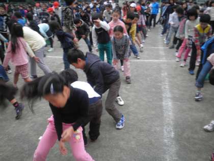 また、ボール送りゲームでは、低学年の子に合わせるために、腰をかがめたり、膝を曲げたりと、下学年の子どもに、とても優しく接しています。