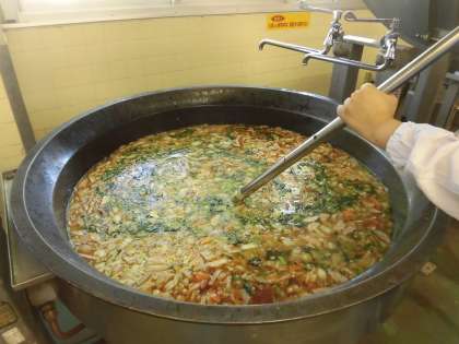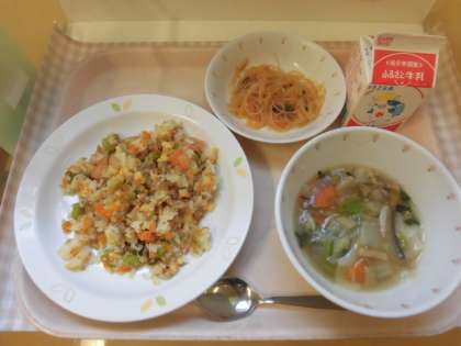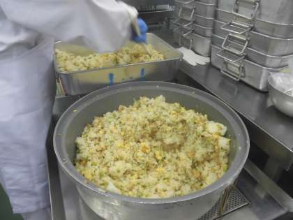 ☆今日の給食の「チャーハン」には、たくさんの食材が使われています。具材も色々と入って、美味しいチャーハンの完成です。それに加えて子どもたちの好きな、ワンタンスープでした。