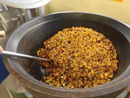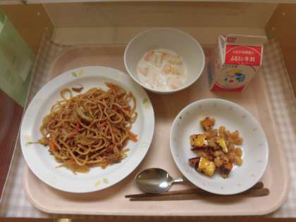 ☆今日の給食は「お豆かりんとう」です。カラッと揚げたさつま芋と大豆に、甘いタレと黒ごまを和えた料理となります。