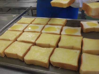☆今日は、子どもたちの好きな「はちみつレモントースト」です。バター はちみつ レモン果汁を合わせ、パンに塗りオーブンで焼きました。レモンの酸味が全体を爽やかな感じに引き立てます。