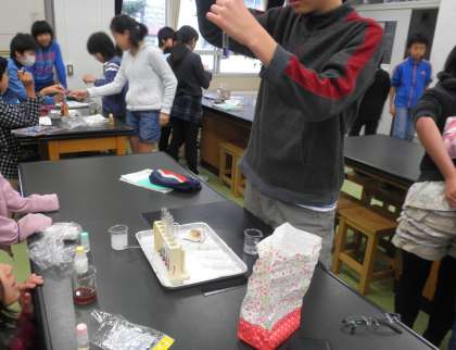 自分たちで実験したいのものをもってきたようで、どの班も夢中になって取り組んでいました。紫キャベツで酸性、アルカリ性を調べるととてもきれいな結果が出ます。