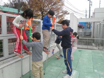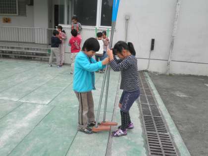 2年生が生活科の学習「昔の遊び」で竹馬やけん玉に挑戦しています。竹馬は2人組になって支えてあげることから始めているようです。
