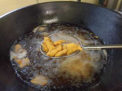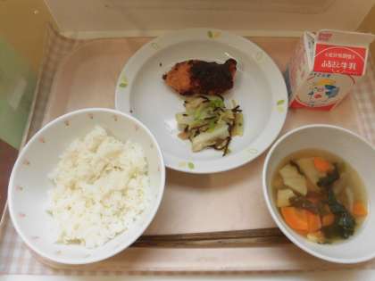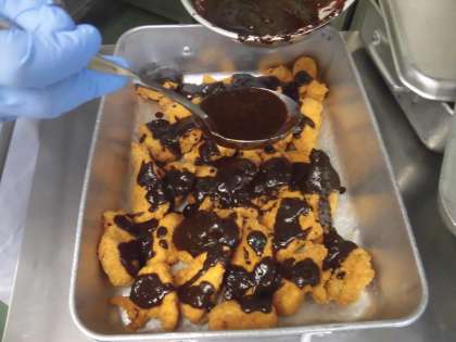 給食室では、みそダレを作り、揚げたてのチキンカツの上にかけて食べました。